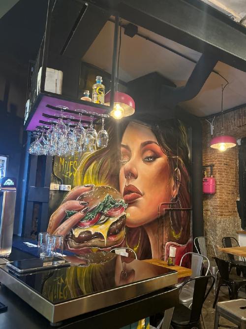 El enfoque de la comida de RUAR se refleja en el diseño del restaurante, donde destacan unos murales decorativos que recuerdan a grafitis, agregando un toque artístico y contemporáneo al ambiente. Estos murales se complementan con una impresionante pared de ladrillos que proporciona una sensación industrial y moderna al lugar. Esta combinación visual crea una atmósfera acogedora y trendy que captura el estilo urbano y moderno del restaurante.