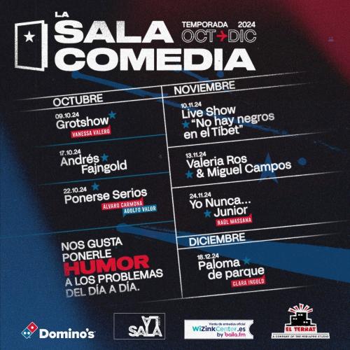 Ya en el mes de noviembre los espectadores podrán disfrutar el domingo 10 del explosivo live show “No hay negros en el Tíbet”, de los humoristas Asaari Bibang y Lamine Thior y el beatmaker master Frank T. El miércoles 20, Ignatius Farray llegará a La Sala Comedia con un espectáculo que no pasará desapercibido y cerrará el mes de noviembre con broche de oro. A continuación, Raúl Massana presentará su show "Yo nunca junior", un espectáculo clandestino por el que han pasado celebridades tan dispares como Susi Caramelo, Xuso Jones o la banda Sidecars, y que, por fin, se presenta en el gran formato que le hace justicia. Ya en diciembre, la primera temporada cerrará el miércoles 18 de diciembre con “Paloma de parque”, el nuevo stand-up de Clara Ingold, donde el humor y sus vivencias personales darán voz los problemas de toda una generación, convirtiendo así a la “La Sala Comedia by Domino’s” en una plataforma de humor, expresión y reflexión.