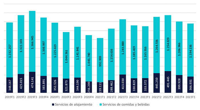 En lo que se refiere al primer trimestre de 2023, el empleo en hostelería disminuyó en casi 46.000 personas respecto a los tres meses anteriores. Esta pérdida de empleo es más pronunciada en Servicios de alojamiento, con 33.000 puestos de trabajo, debido a la estacionalidad del segmento.