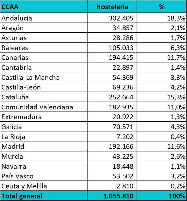 En cuanto a comunidades autónomas, Andalucía destaca por encima del resto de comunidades en la distribución geográfica del empleo en el sector de Hostelería, ya que concentra más del 18% de la actividad nacional. La siguen Cataluña (15,3%), Canarias (11,7%), la Comunidad de Madrid (11,6%), la Comunitat Valenciana (11%), todas ellas con pesos superiores al 10%.