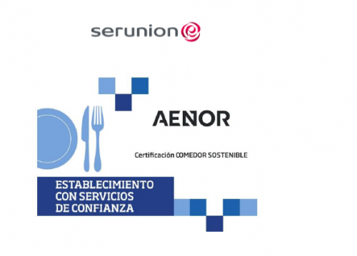 SERUNION es la primera y única empresa del sector de la restauración colectiva que obtiene el certificado de AENOR, el aval que permite identificar los comedores que tienen en cuenta siente aspectos con impacto directo y medible para minimizar la huella de carbono, con la reducción de los gases de efecto invernadero, como alimentos de proximidad, el consumo de frutas y verduras frescas y de temporada, o la mejora en la eficiencia energética, entre otras.