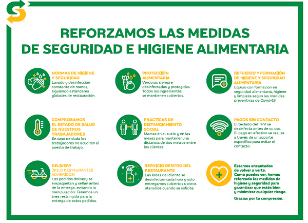 “La red de franquiciados de Subway suponen una gran comunidad que apoya y fomenta el emprendimiento, por lo que comenzar a reactivar cada uno de los negocios de una forma segura es toda una señal de optimismo”, afirma Carlos Ávila, Responsable de Expansión de la región de Cataluña de Subway. “Por ello, estamos preparando cada uno de los restaurantes de Subway en España con todas las medidas de seguridad tanto para los trabajadores como para los clientes y proveedores. Desde la reducción del aforo en los restaurantes hasta la limpieza e higienización de los mismos cada hora del día, para que todos podamos volver a disfrutar de la experiencia Subway”.