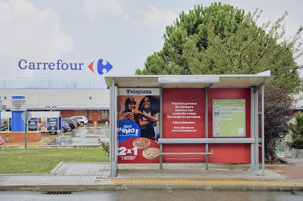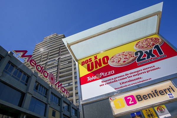 “Nuestra promo de siempre merece ser contada como las mejores promos”, afirma el cartel que Telepizza ha colocado estratégicamente en diferentes puntos de Madrid y Valencia al lado de los establecimientos de emblemáticas marcas como MediaMarkt, Carrefour o Decathlon simulando los colores y la imagen de cada una de ellas.