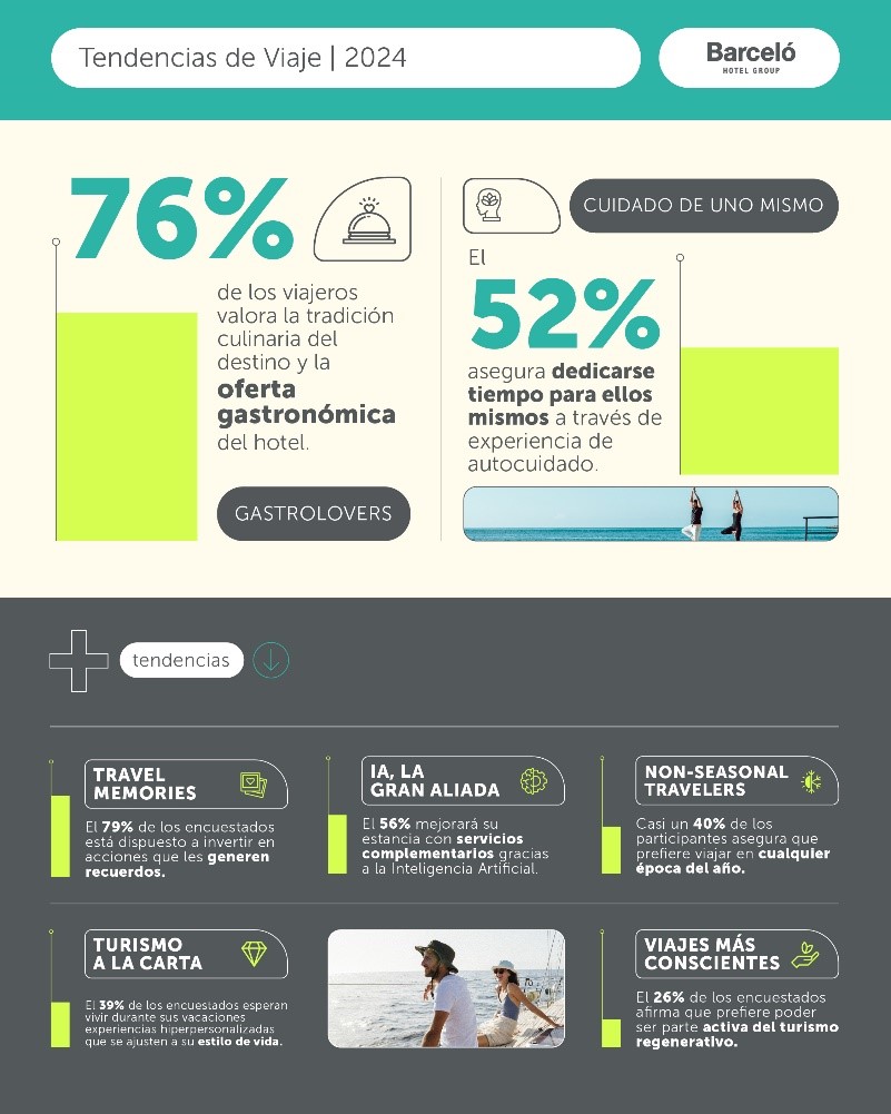 La encuesta realizada por Barceló Hotel Group en las redes sociales revela las tendencias viajeras para este 2024. La oferta gastronómica, las experiencias locales sostenibles y el wellness como terapia determinarán más que nunca la elección del destino por parte de los viajeros