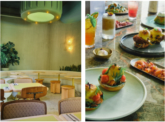 El nuevo establecimiento sigue un estilo retrofuturista que huye de los colores monocromáticos, apostando por una amplia gama de verdes como el kaki, el menta o el pistacho. Además, el diseño ha integrado todo tipo de mobiliario, desde sillas de oficina de estilo inglés barroco hasta taburetes a medida o un sofá semicircular, elementos que conviven en armonía en todos los espacios del local. El carácter propio del nuevo establecimiento puede percibirse además a través de algunos detalles únicos y de lo más originales como sus lámparas, que han sido diseñadas ad hoc por los interioristas y diseñadores de Pichiglas.
