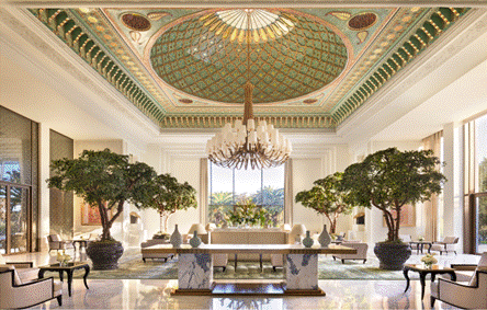 Al llegar, los huéspedes quedarán encantados por la grandeza y majestuosa elegancia del hotel. El alto techo exhibe un trabajo artesanal meticuloso, embellecido con muqarnas, un icónico elemento arquitectónico árabe-andalusí de la era almorávide. La cúpula, decorada con patrones geométricos y florales, domina el techo con tonos verdes, dorados y toques de rojo. En el corazón del vestíbulo, magníficos bonsáis aportan una frescura única al palacio y elegantes lámparas de araña adornan el techo. Las paredes, decoradas con singulares frescos de gebs marroquíes, transforman el yeso en verdaderas obras maestras, ilustrando la destreza de los artesanos locales. Estos frescos florales y geométricos narran las historias y leyendas de Marruecos a través de sus delicados motivos. La obra maestra del lobby es una sublime y brillante lámpara de araña de estilo Rococó, que se alza majestuosa, añadiendo un toque de esplendor teatral que armoniza con la decoración general. Los interiores han sido cuidadosamente seleccionados para representar la historia y cultura árabe-andalusí, integrando sutilmente toques modernos a través de elegantes muebles. Cada cuadro, cuidadosamente ubicado en las paredes, ilustra momentos emblemáticos de la cultura andalusí y cuenta una historia única, capturando paisajes, escenas de la vida cotidiana o eventos históricos del pasado morisco.
