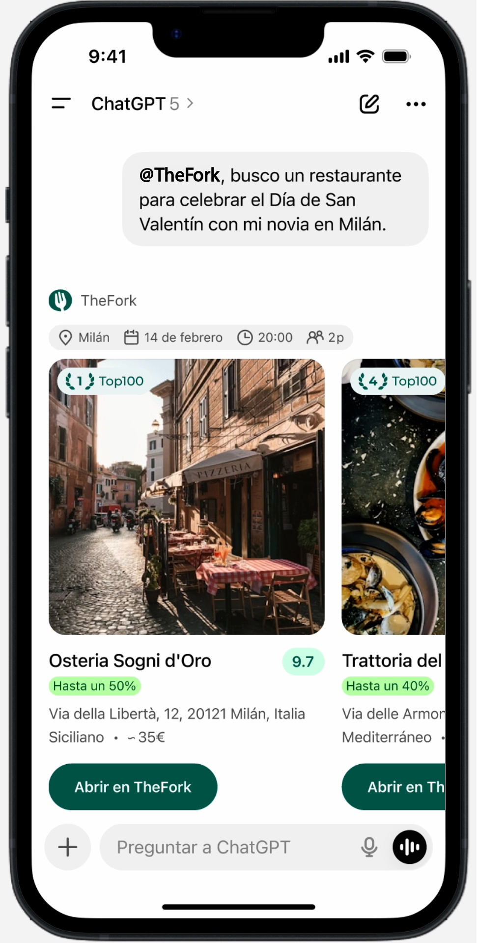 Gracias a este acuerdo, los comensales van a poder hablar directamente con ChatGPT para descubrir restaurantes en tiempo real y reservar a través de TheFork. Gracias a esta integración, tendrán la posibilidad de preguntar dónde comer, especificar un tipo de cocina, elegir un barrio o mencionar una ocasión especial. Como respuesta, ChatGPT mostrará directamente la aplicación de TheFork, con una selección cuidada de restaurantes disponibles en la plataforma, incluyendo fotos, valoraciones, ofertas especiales y disponibilidad, con el objetivo de que reservar mesa lleve solo unos segundos.