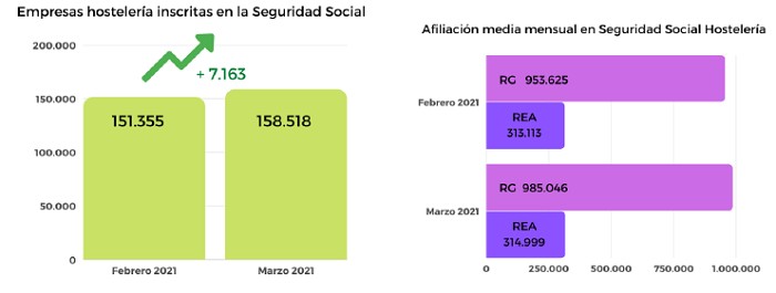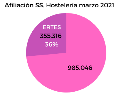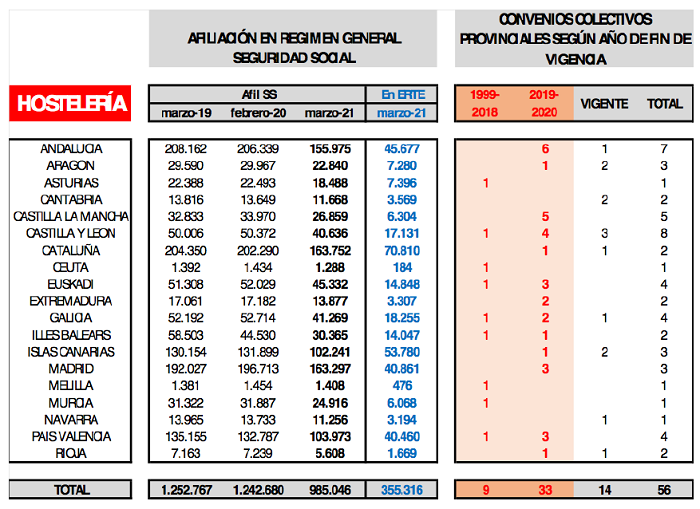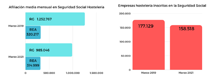Los datos de afiliación a la seguridad social evidencian el impacto de la pandemia sobre el empleo en el sector de Hostelería, al haberse pasado de 1.252.767 personas en alta en régimen general en Marzo de 2019 (o 1.242.680 en Febrero de 2020, antes del estallido de la pandemia) a 985.046 personas en alta en Marzo de 2021, de las que 355.316 están en situación de ERTE en sus diferentes modalidades.