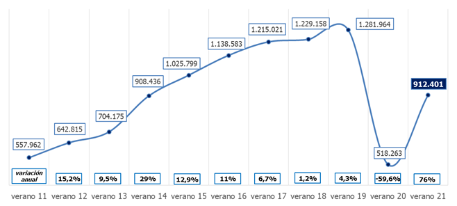 De hecho, el volumen de contratos recogidos durante 2019 fue el más alto de los últimos diez años. Este indicador del mercado laboral no ha dejado de crecer hasta entonces, un incremento interrumpido por la pandemia en 2020 y que provocó que los contratos en hostelería cayesen un 59,6%, hasta las 518.263 firmas. Este año, el número de firmas ha experimentado un notable rebote, al crecer un 76% y alcanzar los 912.401 contratos. El volumen de este año está al nivel del obtenido en el verano de 2014, cuando se firmaron 908.436.