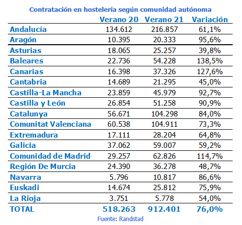 El estudio de Randstad también ha tenido en cuenta la comunidad donde se han firmado los contratos. Los dos archipiélagos lideran los incrementos de la contratación en el sector hostelero del país. En concreto un 138,5% en el caso de Baleares, y un 127,6% en Canarias, seguidos por la Comunidad Madrid, con un crecimiento del 114,7%.