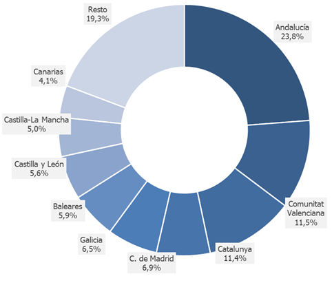 Ya con volúmenes más discretos se sitúan la Comunidad de Madrid (62.826), Galicia (59.007), Baleares (54.228), Castilla y León (51.258), Castilla-La Mancha (45.979), Canarias (37.326) y la Región de Murcia (36.278). Por debajo de las 30.000 firmas se encuentran Extremadura (28.204), Euskadi (25.812), Asturias (25.257) y Cantabria (21.295). Cierran la lista Aragón (20.333), Navarra (10.817) y La Rioja (5.778).