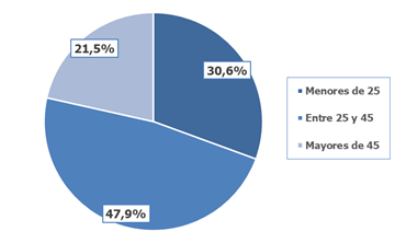 En cuanto a la edad de los firmantes de contratos en este sector durante el verano, cerca de la mitad (47,9%) tienen entre 25 y 45 años. El otro segmento más numeroso es el de los menores de 25 años (30,6%), seguido por el de los mayores de 45 (21,5%).