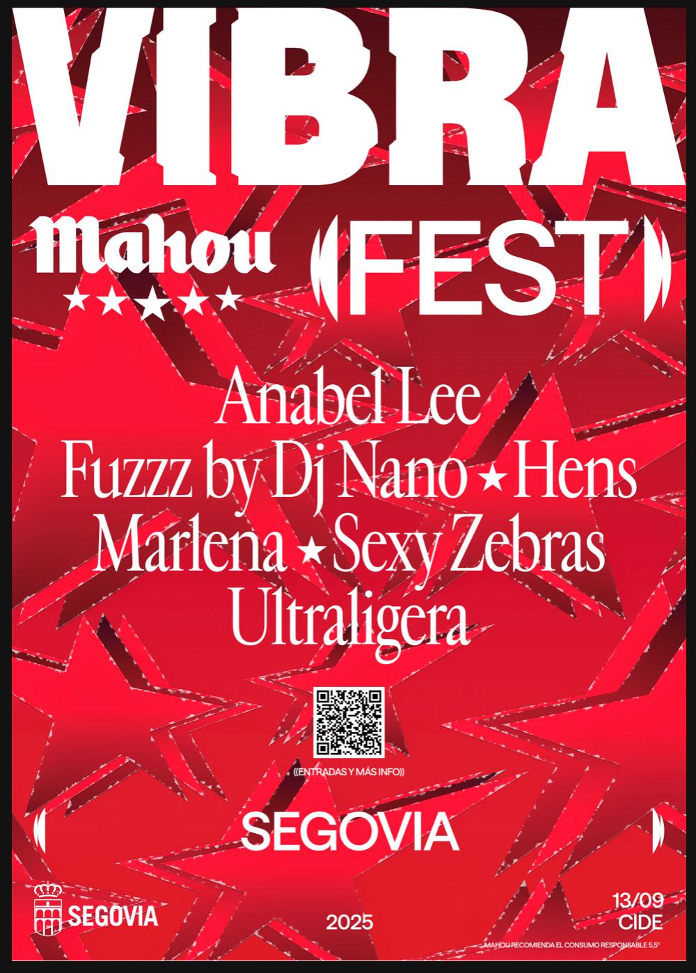 Vibra Mahou Fest, el festival creado por la plataforma de música de Mahou Cinco Estrellas, contará con una nueva parada en 2025 tras pasar por Valladolid, Gijón y León. La ciudad de Segovia acogerá, en el Centro de Innovación y Desarrollo Empresarial (CIDE), doce horas de música en directo el próximo 13 de septiembre con un cartel compuesto por Sexy Zebras, Hens, Marlena, Ultraligera, Anabel Lee y DJ Nano. Esta experiencia cinco estrellas se completará con djs, bandas locales, una propuesta gastronómica de calidad y propuestas que fomentan la cultura cervecera. Además, como parte de su apuesta musical en la ciudad, Vibra Mahou llevará a Barry B en concierto el 24 de junio con un concierto especial que formará parte del programa de las fiestas patronales de Segovia.