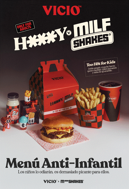 Todas estas acciones han sido la excusa para presentar, “H***Y v MILFSHAKES), el menú formado por una hot burger, de carne o de pollo, acompañadas de un mini shake de tres leches, pocket fries, bebida y una figura coleccionable, VICIO pretende demostrar que H***Y v MILFSHAKES es una experiencia hecha exclusivamente para un público adulto: demasiado picante, demasiado premium y divertida para que lo coman los niños. Este nuevo pack estará disponible desde el 6 de febrero hasta el 14 de marzo tanto en sus 31 locales repartidos por todo el territorio nacional, como en su ecommerce y en Glovo.
