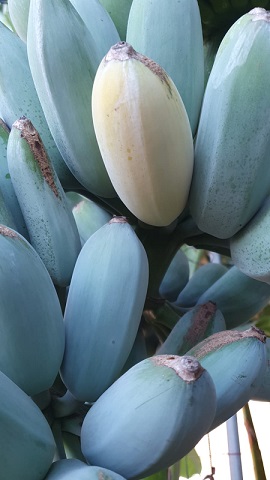 El plátano azul, originario del sudeste asiático y cultivado en muchos lugares del mundo, como es el caso de Hawái, Filipinas o, incluso, en Centroamérica, se caracteriza por tener una pulpa blanquecina y mayor longitud y grosor que un plátano procedente de la platanera más común: la pequeña enana. El color azul de la fruta es debido a un recubrimiento de cera natural, y se vuelve amarillo con el avance de la maduración. Su sabor es suave y puede consumirse en preparaciones dulces y saladas.