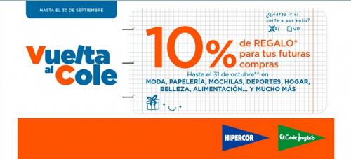 Se bonificarán las compras enmarcadas en la “Vuelta al Cole” con un 10% del importe en el caso del material escolar y libros de texto, uniformidad, zapatería infantil, calzado deportivo, mochilas y papelería. Estas bonificaciones serán canjeables hasta el 31 de octubre en compras superiores a 30 euros en departamentos como papelería, mochilas, electrónica, electrodomésticos, deportes, moda, accesorios, zapatería, belleza, hogar y juguetes, excepto en calzado de uniformidad, uniformes y calcetería colegial, diccionarios y libros de texto, material deportivo, consolas y marcas de lujo.