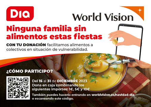 Del 15 al 31 de diciembre, Dia se suma a la campaña ‘Ninguna familia sin alimentos estas fiestas’ de World Vision con una recaudación de fondos destinada a brindar un menú completo y saludable a personas en situación de vulnerabilidad a través de los comedores sociales de la organización. Los clientes y empleados de Dia podrán colaborar en esta iniciativa solidaria mediante donaciones en tienda con tarjetas digitales de 1, 5 y 10 euros, o a través de la página web de World Vision. En el marco de esta iniciativa, en 2022 la compañía recaudó más de 41.000 euros para acercar una alimentación de calidad a familias vulnerables, lo que se tradujo en una cesta de alimentos básicos para 8.200 familias