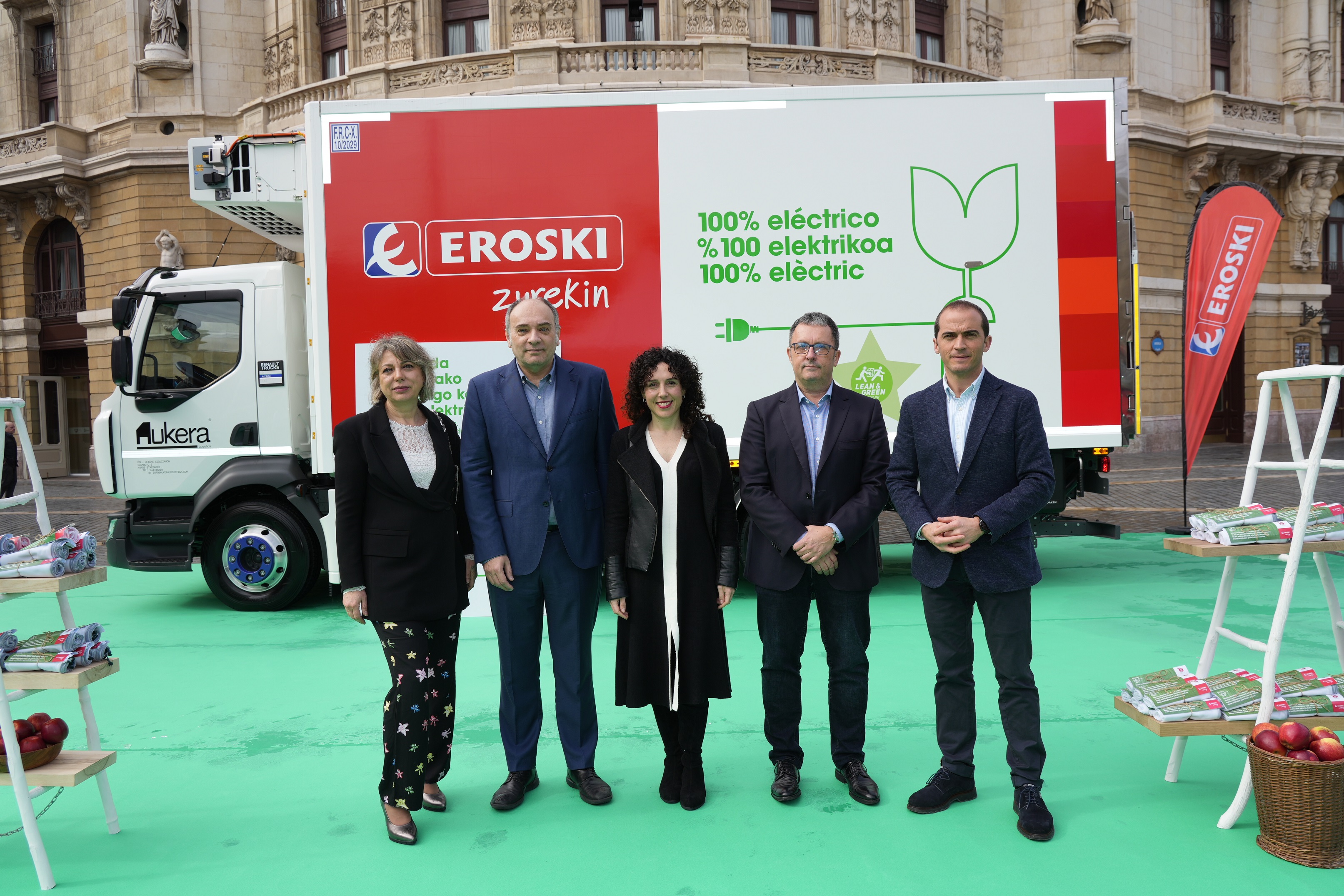El acto de presentación ha tenido lugar en la plaza del teatro Arriaga y ha contado con la presencia de la teniente de alcalde y concejala de Movilidad y Sostenibilidad, Nora Abete; el director del Ente Vasco de Energía, Iñigo Ansola; el director de Salud y Sostenibilidad de EROSKI, Alejandro Martínez Berriochoa, el director de Transporte de EROSKI, Juantxu Aranbarri y la responsable de transporte y distribución de EROSKI, Cristina Lorenzo.