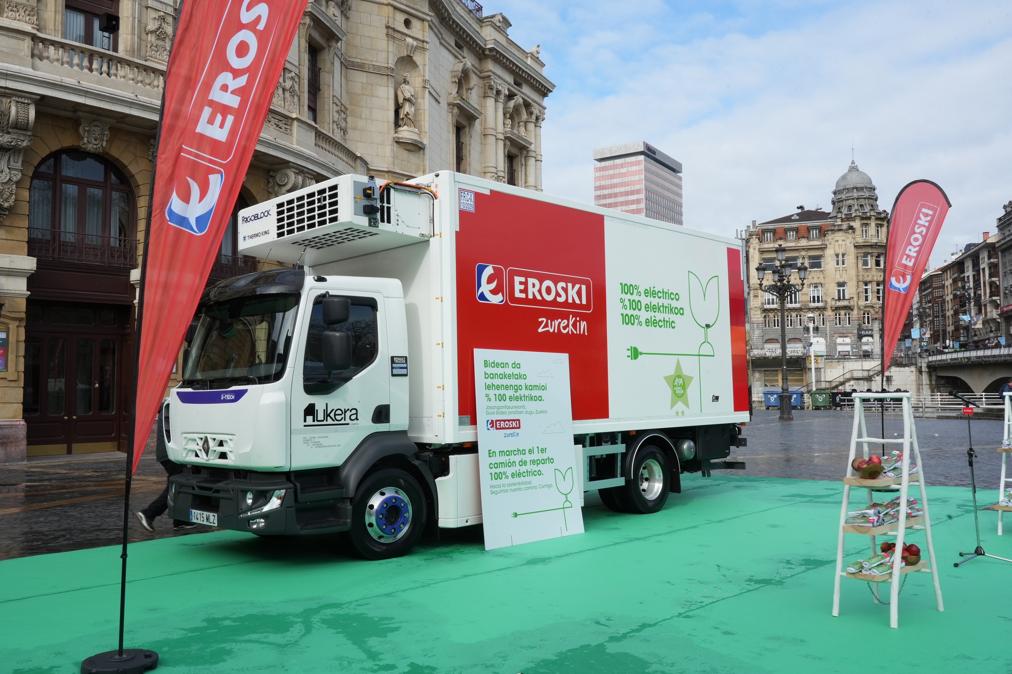 • El camión está impulsado por cuatro baterías eléctricas y tiene una autonomía de 211 kilómetros a plena carga • Permitirá evitar la emisión de más de 45 toneladas de CO₂ al año, lo que equivale al CO₂ capturado por más de 2.000 árboles • El acto de presentación ha tenido lugar hoy en la plaza del teatro Arriaga de Bilbao con representantes municipales, del Ente Vasco de Energía y de EROSKI • EROSKI ha reducido su huella de carbono más de un 42% desde el 2017: equivalente a más de 95.000 coches circulando 10.000 kilómetros
