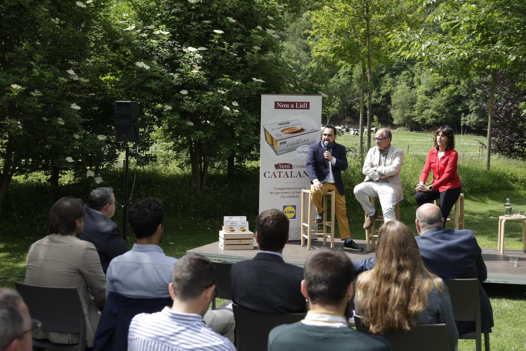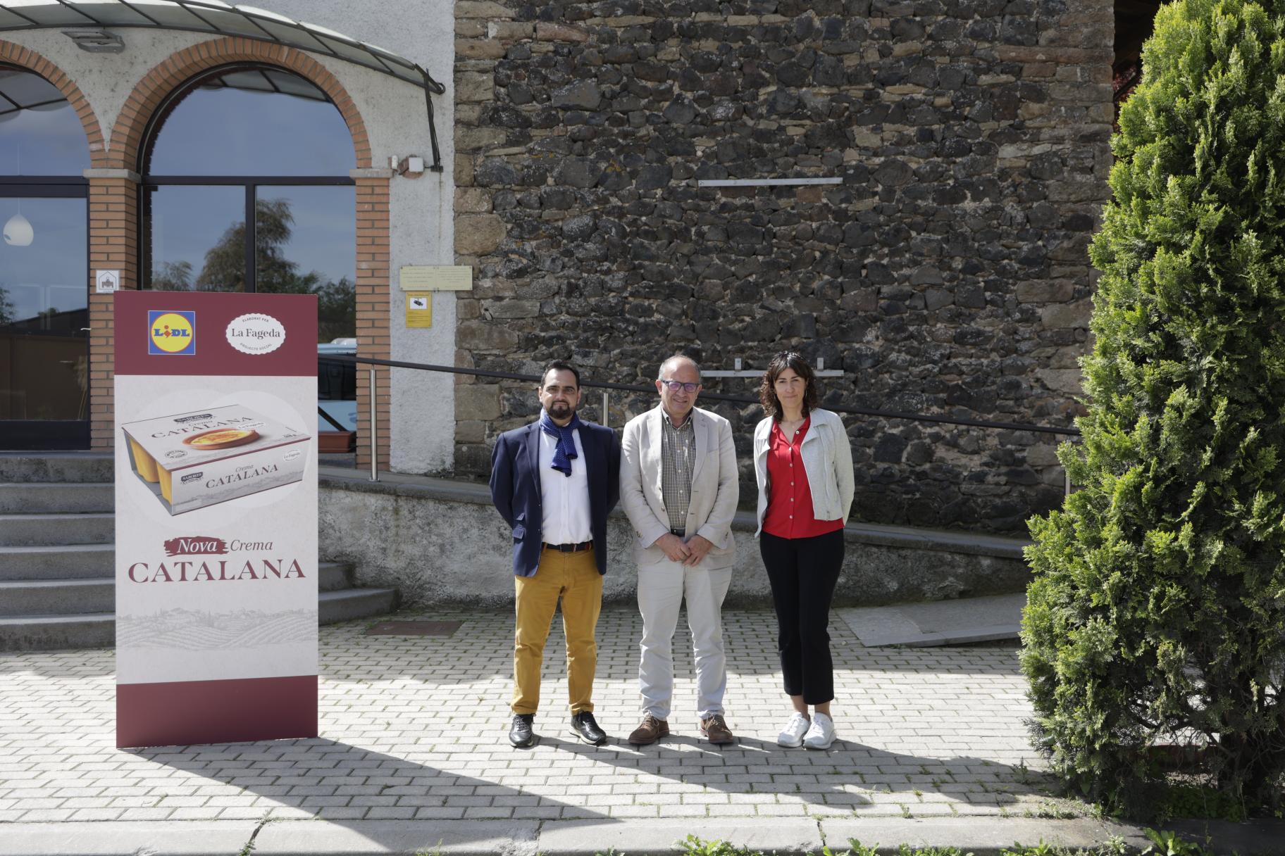 La nueva crema catalana ha sido presentada hoy en la comarca de La Garrotxa, concretamente en las instalaciones de La Fageda. El acto ha contado con la presencia institucional del director general de Empresas Agroalimentarias, Calidad y Gastronomía del Departamento de Acción Climática, Alimentación y Agenda Rural, el Sr. Joan Gòdia; la directora general de La Fageda, Sílvia Domènech y el gerente de compras regionales de Lidl Supermercados, Jordi Morales.