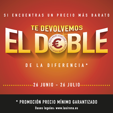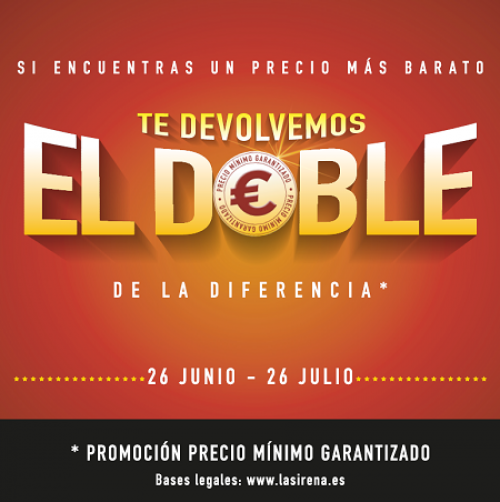 La Sirena, cadena española líder en alimentos congelados, presenta su campaña “PRECIO MINIMO GARANTIZADO, si encuentras un precio más bajo, te devolvemos el doble de la diferencia”. Con esta iniciativa, los clientes de la compañía podrán comparar el precio de sus productos con el de otras cadenas de supermercados y, en caso de detectar que el mismo producto más barato, la compañía les devolverá el doble de la diferencia de precio.