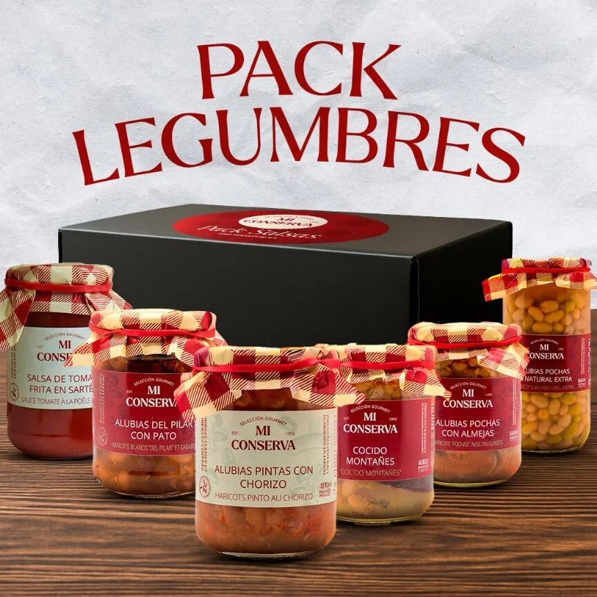• Este pack incluye: alubias del Pilar con pato, alubias con chorizo, cocido montañés, pochas con almejas, pochas al natural y tomate frito.