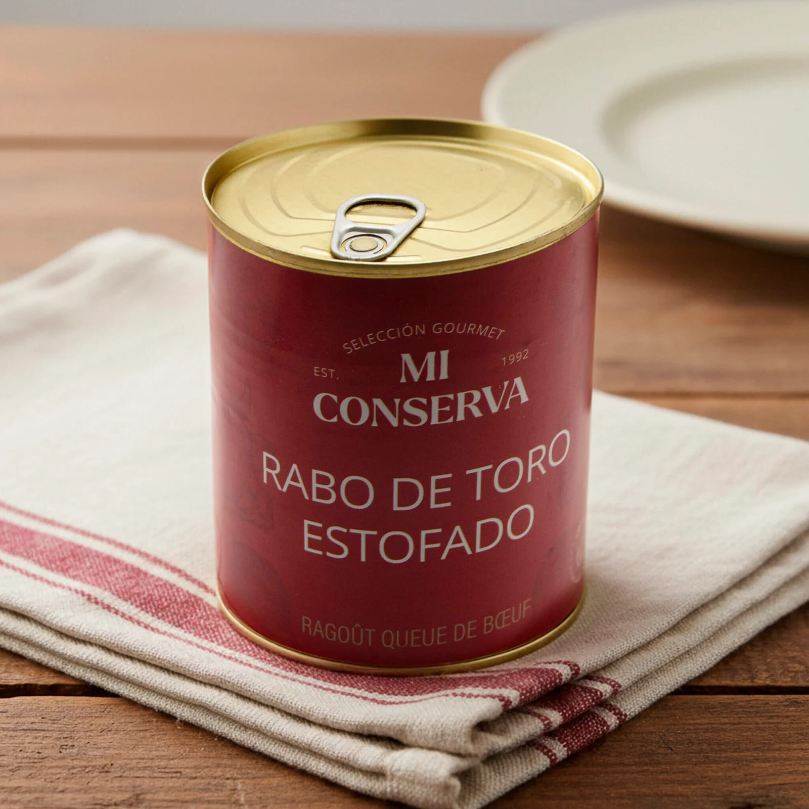 • Piezas de rabo de vacuno (41%) cocinadas lentamente con cebolla, zanahoria, vino blanco, tomate, ajo y hierbas aromáticas hasta quedar melosas, con una salsa oscura y brillante.