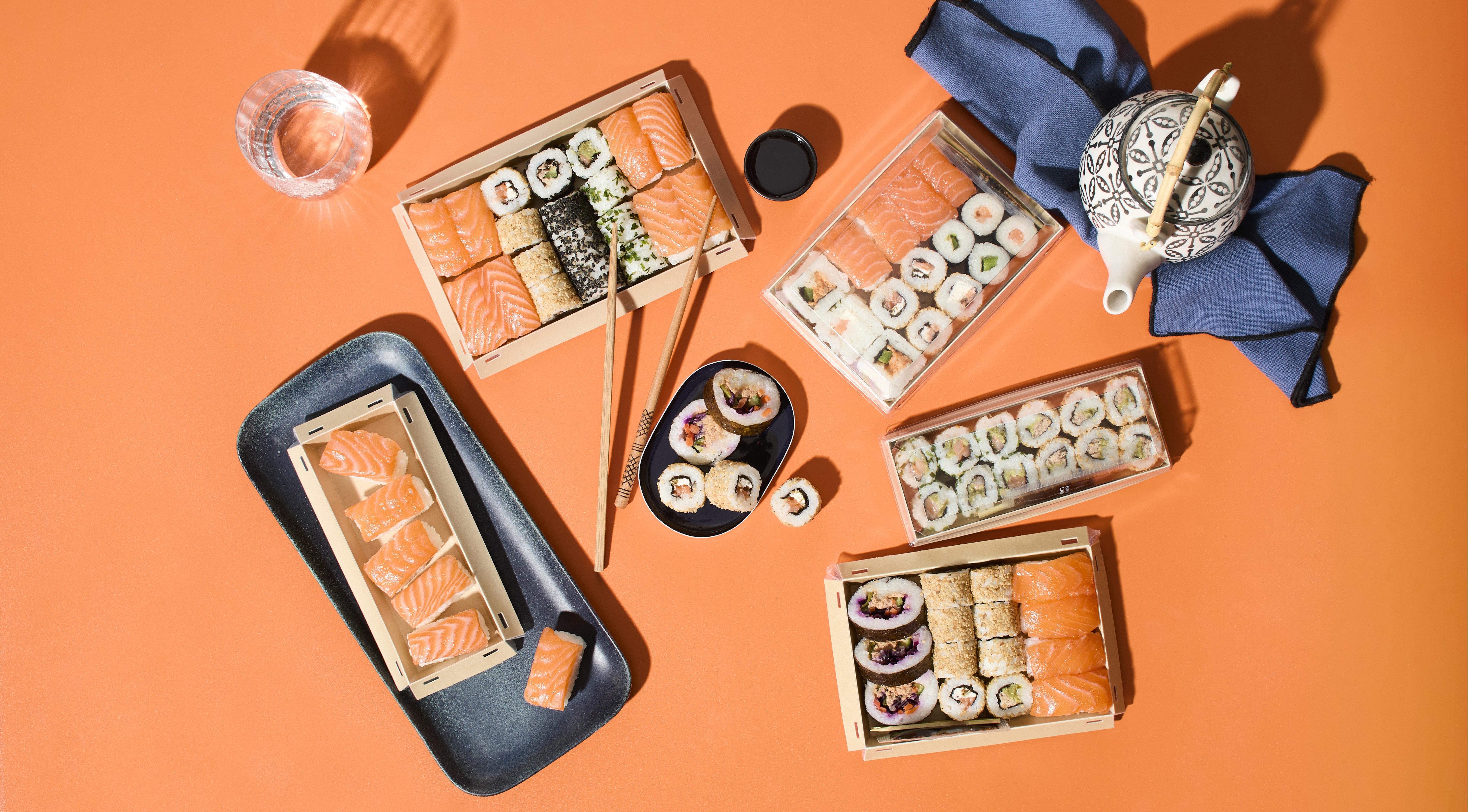 - Box Aperitivo (20 piezas): selección variada de california rolls con salmón, atún, queso, especias, yuzu y curry rojo.