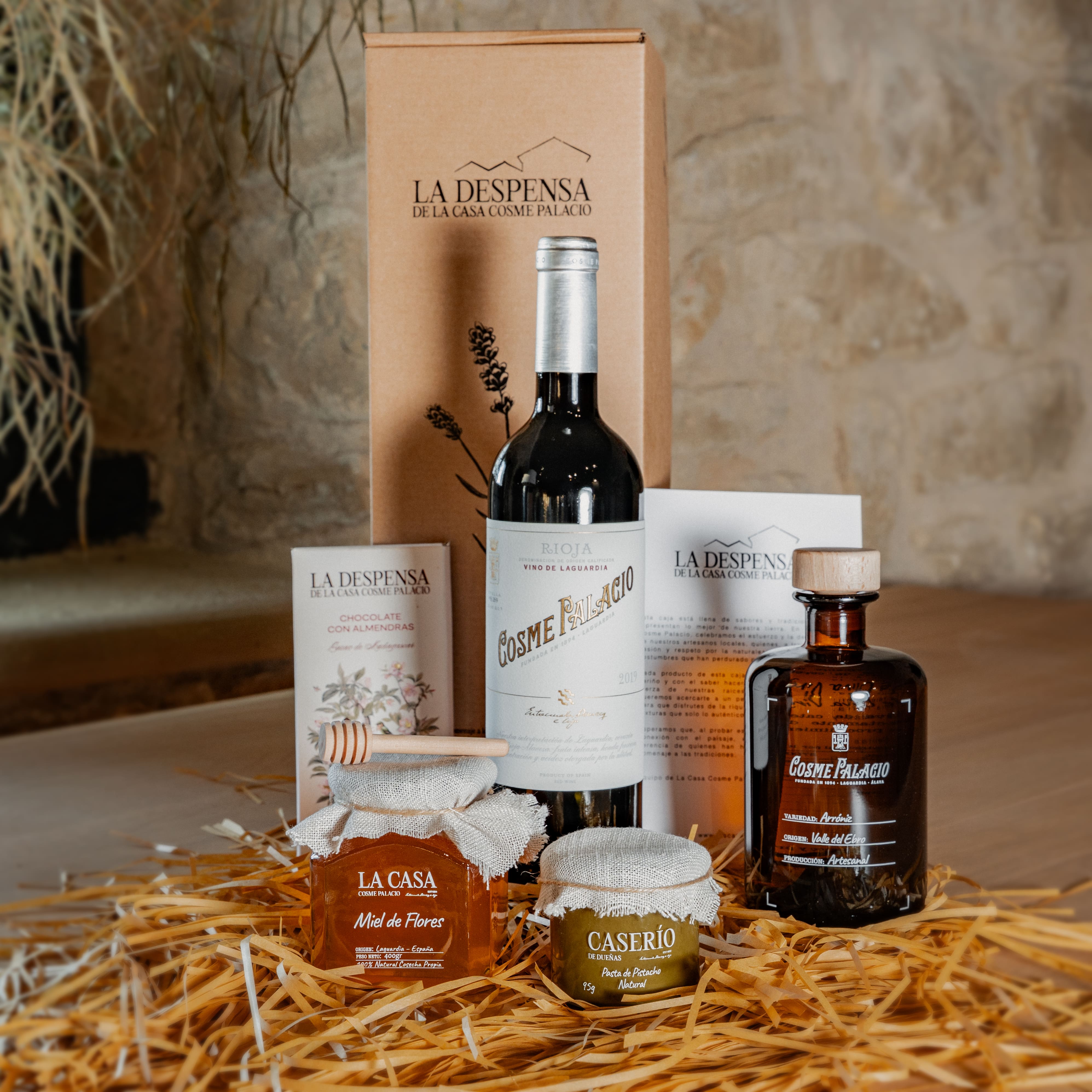 Una propuesta única y a medida, diseñada para crear un regalo gourmet de lujo verdaderamente personalizado. Cada cesta es un regalo único que puede incluir desde la Miel de Flores, recolectada de los jardines que rodean La Casa Cosme Palacio en la Rioja Alavesa, hasta el Aceite de Oliva Virgen Extra, elaborado con frutos de olivares cultivados junto a la bodega. Para los momentos más dulces, el Chocolate con Almendras combina la suavidad del mejor chocolate con el crujir de almendras seleccionadas, mientras que la Pasta de Pistacho Natural, hecha con pistachos cultivados junto a Caserío de Dueñas, el alojamiento de Las Casas en Medina del Campo, ofrece un sabor intenso y envolvente. Y, por supuesto, los vinos de Cosme Palacio completan esta experiencia, perfecta para celebrar estas fechas tan especiales con un toque de distinción y cariño.
