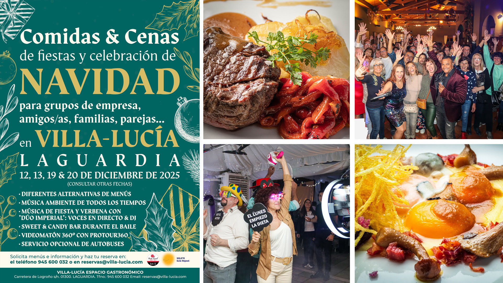 Las hojas del calendario han volado sin darnos cuenta, el espíritu navideño ya roza nuestras puertas. En este tiempo de reencuentros y promesas, Villa-Lucía se erige, como cada año, en el escenario perfecto para forjar recuerdos inolvidables. Tanto si es una reunión íntima de familiares, una vibrante congregación de amigos, o un distinguido encuentro corporativo, encontrarán aquí una buena opción para culminar el año con una celebración emocionante y alzar la copa por un prometedor 2026. Con cuatro exquisitos menús, diseñados con mimo para hacer del evento algo verdaderamente especial. Música en directo, sorpresas, y una gran propuesta enogastronómica, concebida por el primer restaurante Km. 0 de la D.O.Ca. Rioja, acreditado por Slow Food y distinguido con un prestigioso Solete Repsol. ¿Se os ocurre un plan mejor?