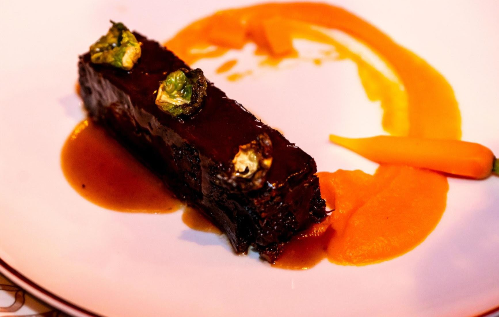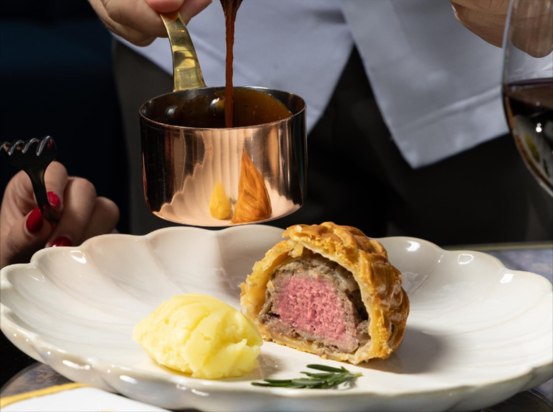 Esta propuesta navideña, firmada por el chef Ramón Freixa, y diseñada para grupos a partir de diez personas, cuenta con una variedad de entrantes exquisitos, como por ejemplo la royal de almendras tiernas con translúcido de amaretto y mousse de huevas de arenque; así como numerosas opciones de platos principales de lo más especiales, entre ellos el icónico solomillo Wellington o el rabo de buey a la royal con puré de calabaza asada y coles.