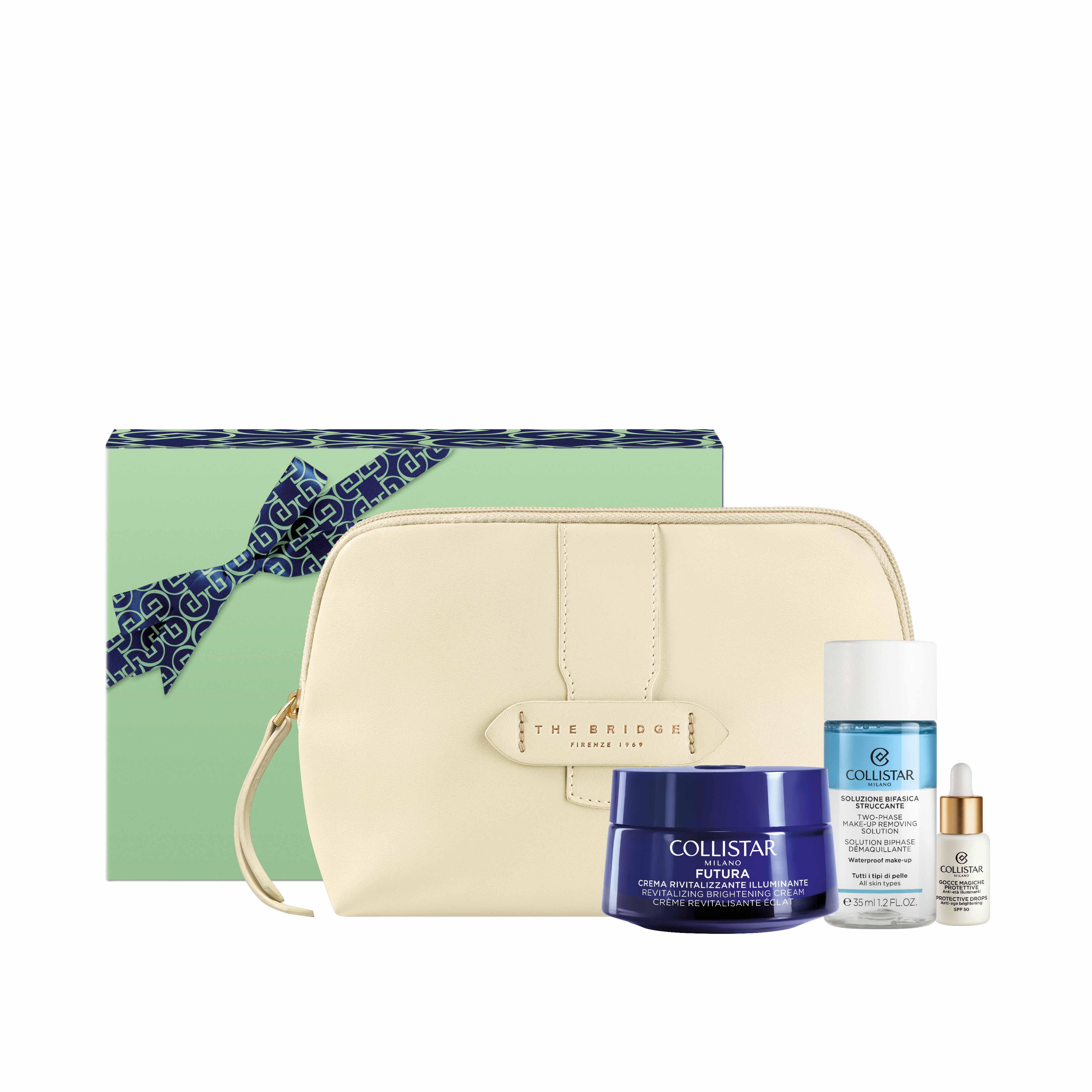 Estuche compuesto por Futura Crema Revitalizante Iluminadora (full size, 50ml), diseñada para revitalizar y preservar la longevidad de la piel, acompañada de dos minitallas: Gotas Mágicas Protectoras SPF50 (5ml) y Solución Bifásica Desmaquillante (35ml) de ojos y labios.