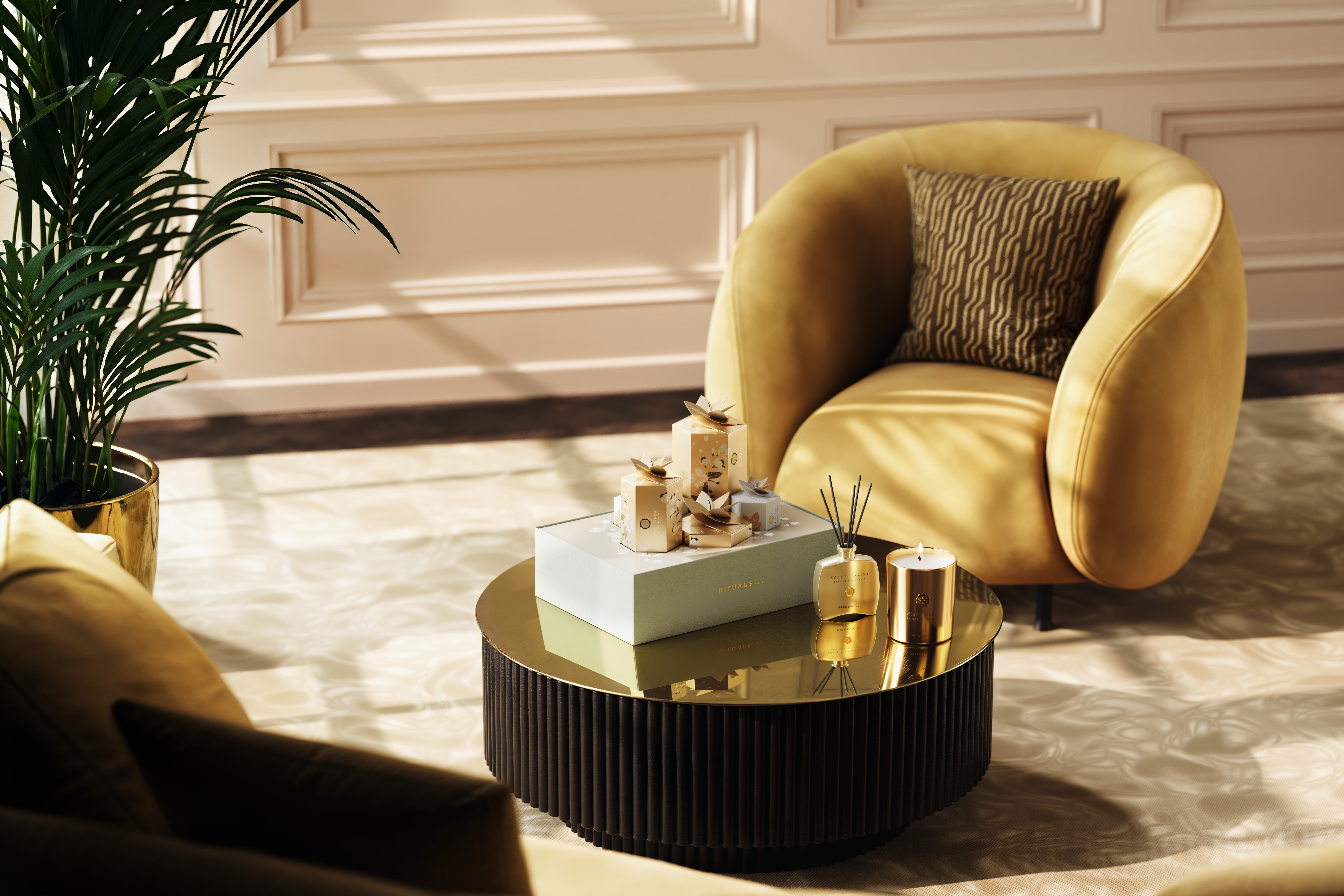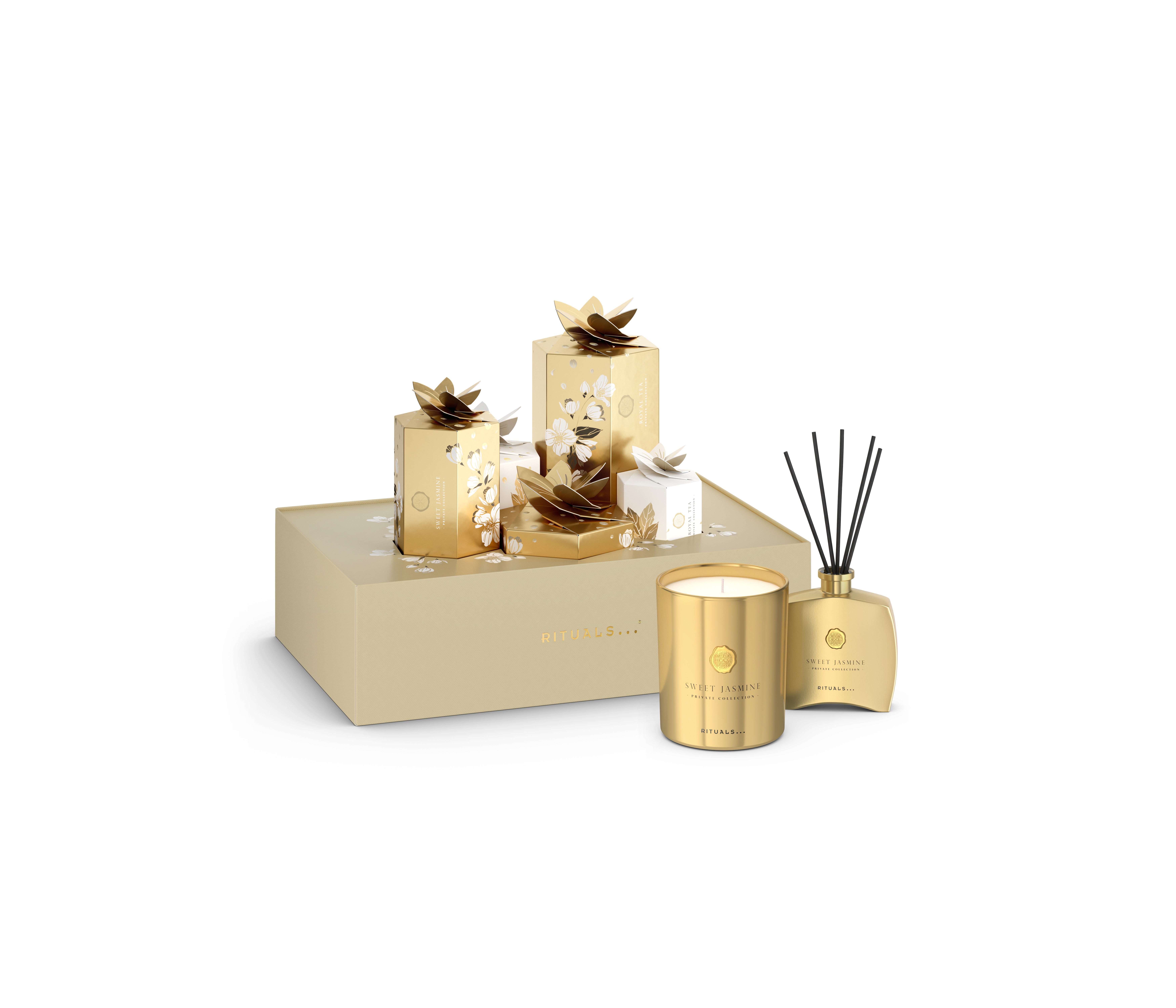 exquisitas. Cada una de sus 5 cajas florales guarda un producto de la colección Private Collection con dos de los aromas más icónicos de esta exclusiva línea para el hogar – Sweet Jasmine y Royal Tea – en formatos especiales y de venta originales.