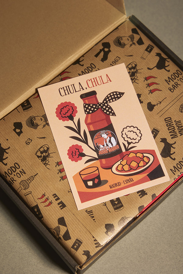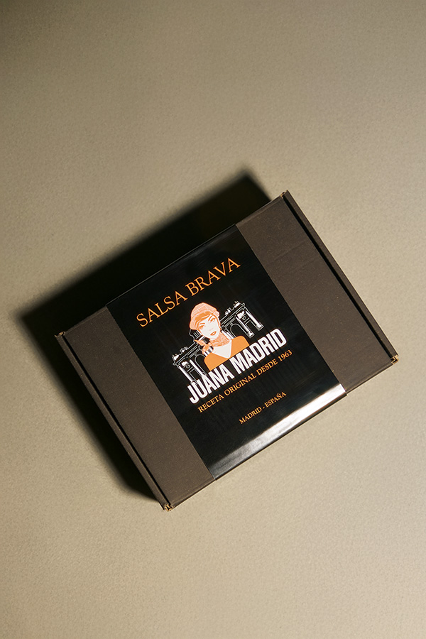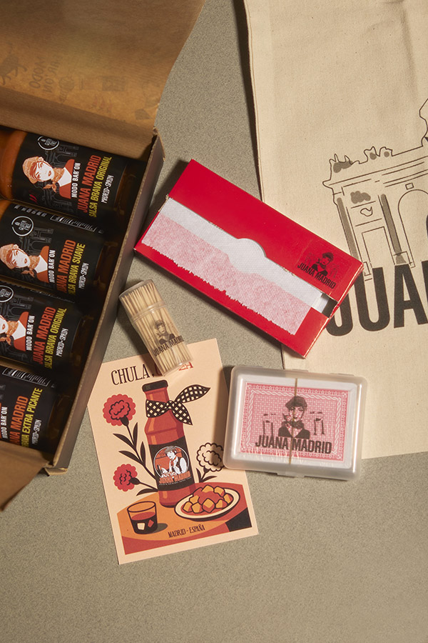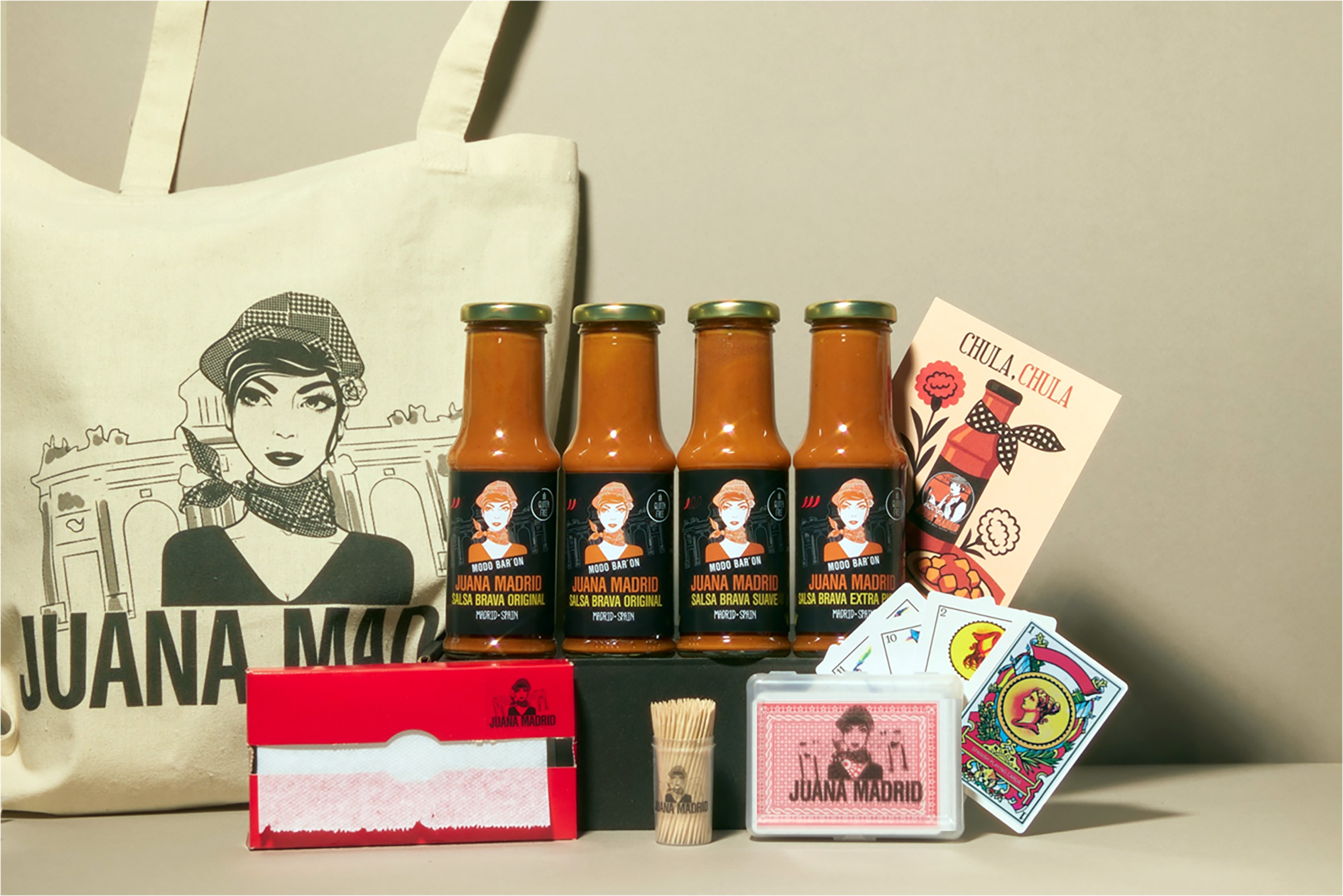 - Pack Bar Juana Madrid ¡RECIÉN LLEGADO! y de venta exclusiva en su web, incluye: 1 palillero clásico, 1 servilletero mítico, 1 baraja de naipes, 1 postal de Juana Madrid, 1 tote bag de la firma y 1 pack de salsa brava de 4 unidades, original (27’99 €) o degustación (29’99 €), presentado en un divertido estuche de cartón.