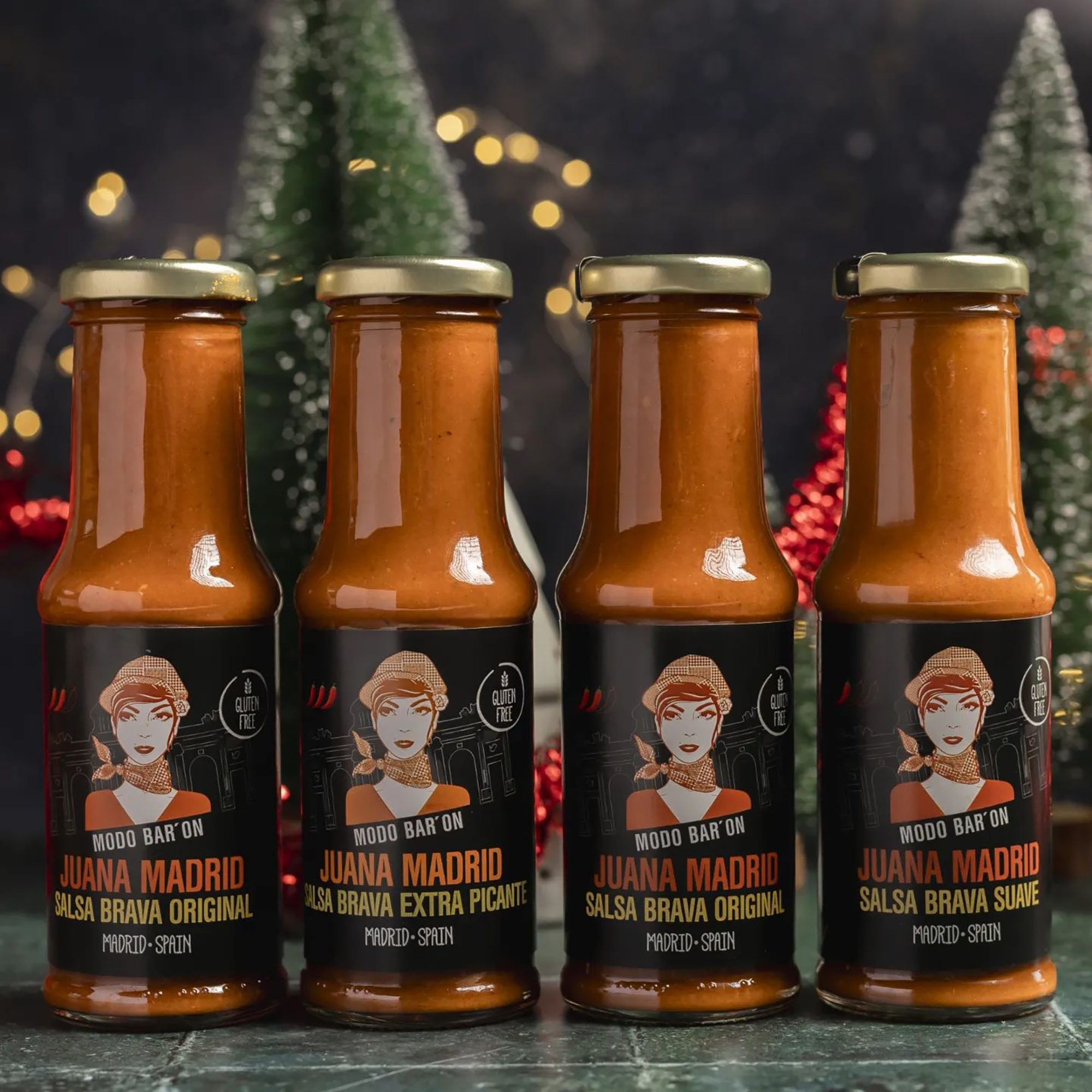 - Pack Original: para los más clásicos. Incluye dos botellas de Juana Madrid Brava Original y dos versiones con diferentes niveles de picante: una Brava Extra Picante y una Brava Suave. 21’99 €.