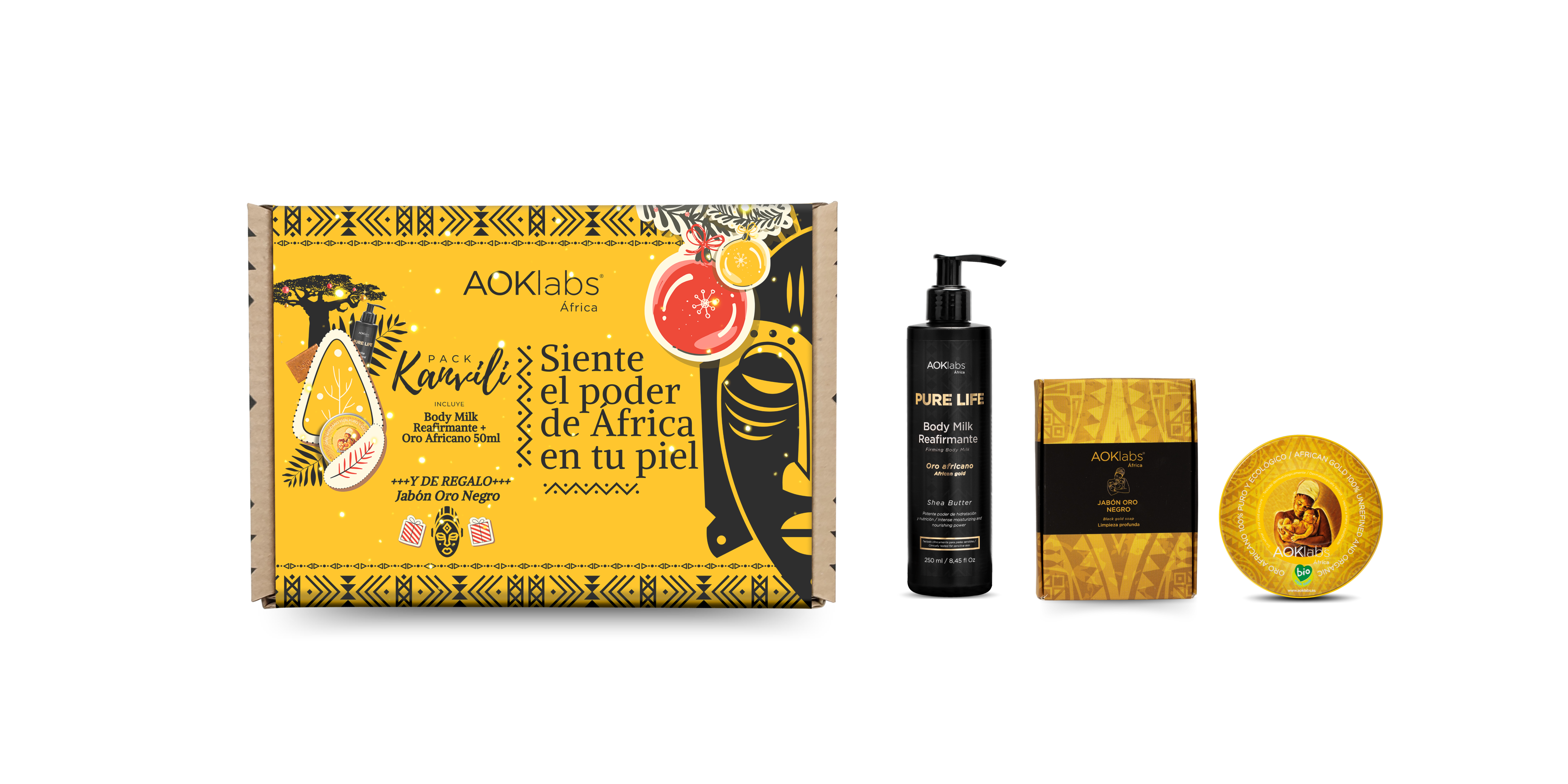 Pack Kanvili (53,99 €). En Kanvilli, una de las cooperativas con las que AOKlabs colabora en Ghana, se procesa la manteca de karité mediante primera presión en frío, donde no se mezcla con conservantes ni estabilizadores. Dentro de este kit está el Oro Africano que nutre equilibra el pH, regenera y mejora incluso las pieles más sensibles; el Body Milk Reafirmante, de rápida