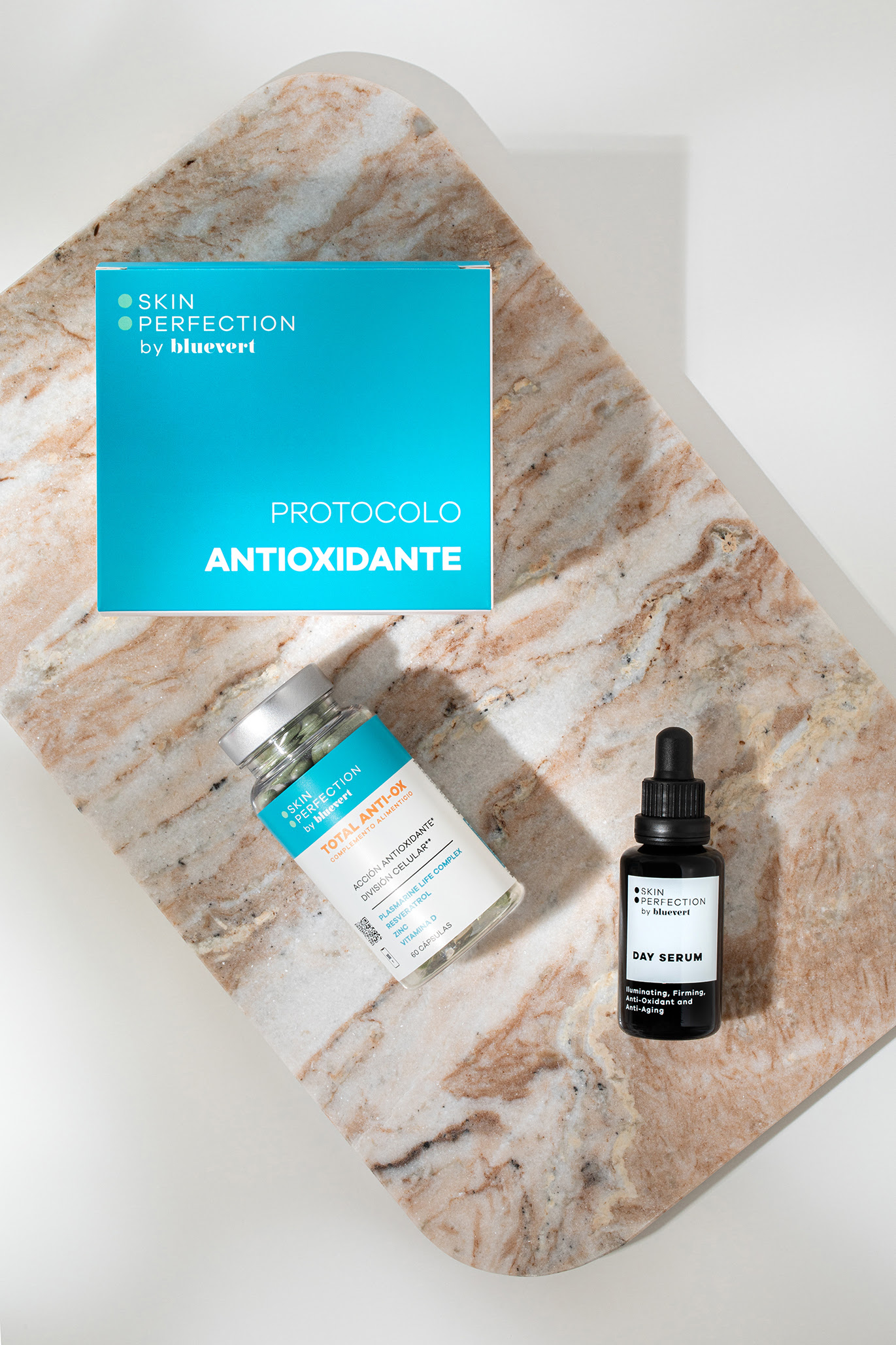 Ya no es ningún secreto que los antioxidantes son aliados indispensables para envejecer de forma saludable y preservar la vitalidad celular. Por eso, Skin Perfection by Bluevert une lo mejor del cuidado antioxidante tópico más puntero con un complemento alimenticio de nueva generación, diseñado para actuar desde dentro. Juntos, mejoran la vida de tus células y, por tanto, el equilibrio y bienestar de todo tu organismo.
