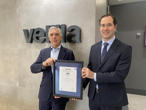 de derecha a izquierda: Enrique Megía, director de la sede de Madrid en AENOR, entrega a Enrique Fernández, director general de Velilla Group, la certificación ISO 14006 en gestión del ecodiseño