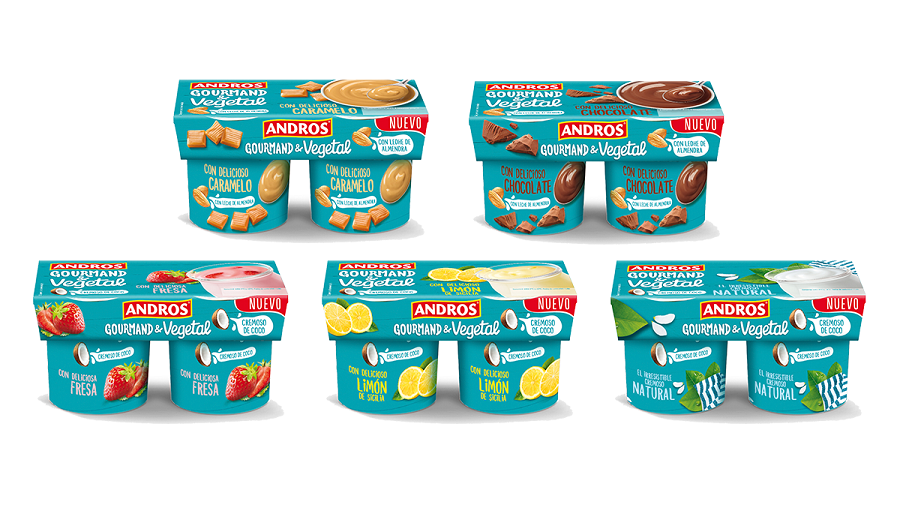 La gama Andros Gourmand & Vegetal, disponible en formato de packs de 2x120 gr, cuenta con una línea de cremosos fermentados compuesta por tres variedades elaboradas con bebida de coco y trozos de fruta natural: Fresa, Limón de Sicilia y la variedad Natural. Por su parte, los postres vegetales están elaborados con leche de almendra y están disponibles en dos sabores: Chocolate y Caramelo.