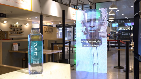 Para ello ambas compañías han colaborado en una acción de impacto en las estaciones de Sants en Barcelona y de Atocha en Madrid. Cuando los viajeros compraban una botella de AUARA en alguno de los establecimientos COMO de Areas, de forma automática aparecía un video holográfico a tamaño real en el que algunos de los beneficiarios de los proyectos sociales de AUARA les contaba quiénes eran y cómo les había cambiado la vida tener acceso a agua potable.