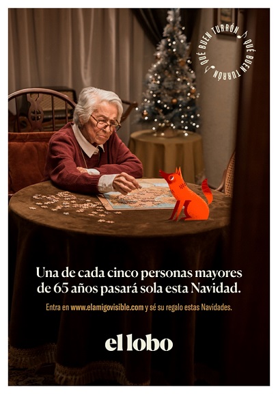 Turrones El Lobo ha lanzado la campaña de sensibilización “El amigo visible” junto a Cruz Roja para combatir la soledad de las personas mayores en Navidad. Se calcula que en España una de cada cinco personas mayores de 65 años vive sola y representan más de 2.000.000 según los últimos datos del INE. Por ello, a través de un spot y de la página web www.elamigovisible.com, la firma anima a formar parte del programa de voluntario de ayuda a personas mayores de Cruz Roja y convertirse en el “el amigo visible” para regalar compañía, comprensión y ayuda desinteresada a cambio de recibir una amistad.