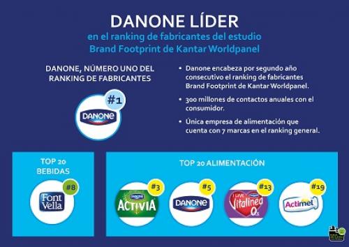19 de mayo de 2016Danone ha obtenido por segundo año consecutivo la primera posición en el ranking general de fabricantes, Brand Footprint, elaborado por Kantar Worldpanel, que analiza las marcas más compradas por los españoles en 2015. Según el estudio realizado por Kantar, Danone es el único fabricante que supera...