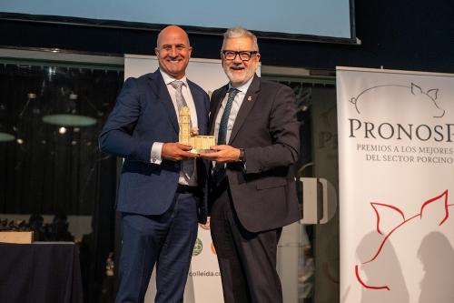 El director de Operaciones de ElPozo Alimentación, Juan Pedro Florido, recibe el premio PronosPorc de manos de Félix Larrosa, alcalde de Lleida y presidente de Mercolleida