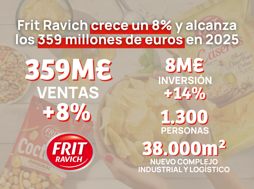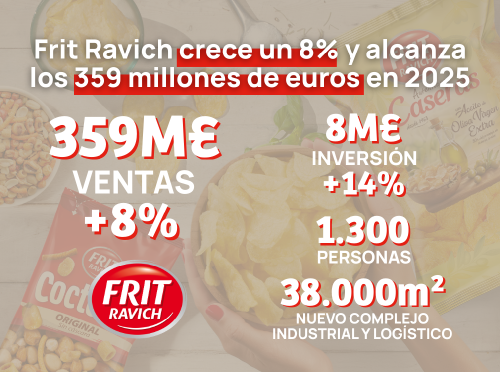 Frit Ravich, empresa familiar especializada en la elaboración de Patatas Fritas, Snacks y Frutos Secos y líder en la distribución de marcas nacionales e internacionales del sector del snacking, consolida su crecimiento tras cerrar 2025 con una facturación de 359 millones de euros, lo que representa un crecimiento del 8% respecto al año anterior.