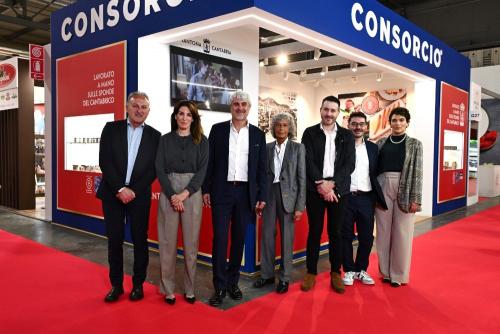 De izquierda a derecha, representantes de Grupo Consorcio en la Feria TuttoFood de Milán, celebrada del 5 al 8 de mayo de 2025: Silvano Fredduzzi, National Account Manager, Valeria Piaggio, Vicepresidenta, Dario De Stefano, General Sales Director Italia,