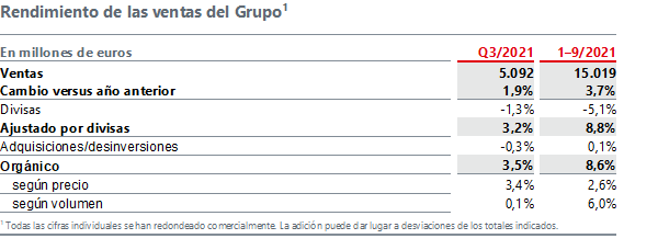 En el tercer trimestre de 2021, las ventas del Grupo han aumentado nominalmente un +1,9% hasta los 5.092 millones de euros. Orgánicamente (es decir, ajustado por el tipo de cambio y adquisiciones/desinversiones), las ventas han aumentado en un +3,5%. A nivel de Grupo, el aumento ha sido impulsado por los precios. El desarrollo de los volúmenes ha variado entre nuestras unidades de negocio. Las adquisiciones y desinversiones han reducido las ventas en un -0,3%. Los efectos del tipo de cambio han afectado las ventas en un -1,3%.