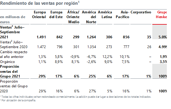 Los mercados emergentes han registrado un crecimiento orgánico de las ventas del +8,3% en el tercer trimestre de 2021. El desarrollo orgánico de las ventas en los mercados maduros ha sido del -0,2% en comparación con el mismo trimestre del año anterior. Hemos podido aumentar las ventas en la región de Europa del Este en un +8,9%. En el tercer trimestre de 2021, hemos logrado un crecimiento orgánico de las ventas del +8,1% en la región de África/Oriente Medio y del +9,0% en la región de Latinoamérica. El crecimiento orgánico de las ventas en la región de Asia-Pacífico ha sido del +7,5%. Mientras que la región de Europa Occidental ha registrado un crecimiento orgánico positivo de las ventas del +1,1%, el desarrollo de las ventas en la región de Norteamérica ha sido negativo en un -2,6%.