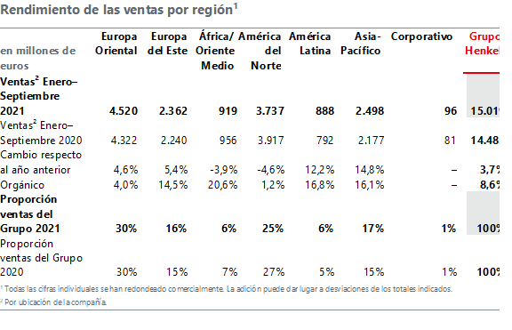 En los primeros nueve meses de 2021, las ventas han aumentado nominalmente en un +3,7% hasta los 15.019 millones de euros. En términos de crecimiento orgánico de las ventas, Henkel ha generado un aumento significativo del +8,6%. Esto se ha debido principalmente al volumen, mientras que una evolución positiva de los precios también ha contribuido al crecimiento.