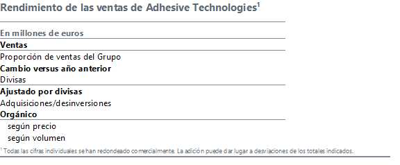 Las ventas en la unidad de negocios de Adhesive Technologies han aumentado nominalmente en un +7,1% a 2.442 millones de euros en el tercer trimestre de 2021. Orgánicamente (es decir, ajustado por el tipo de cambio de divisas y adquisiciones/desinversiones), las ventas han aumento en un +7,0%. El volumen y los precios han contribuido por igual a este aumento. Los efectos del tipo de cambio han reducido las ventas en un -0,4%, mientras que las adquisiciones y desinversiones han tenido un impacto positivo de +0,5%.