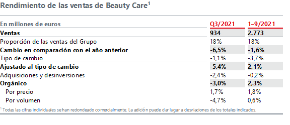 En el tercer trimestre de 2021, las ventas de la unidad de negocio de Beauty Care han decrecido nominalmente un -6,5% alcanzando los 934 millones de euros. A nivel orgánico (ajustado por el tipo de cambio y las adquisiciones y desinversiones), las ventas han bajado un -3,0% en comparación con el año anterior. Aunque los volúmenes han decrecido, la unidad de negocio ha registrado una evolución positiva de los precios. Los efectos del cambio de divisas han reducido las ventas en un -1,1%, y las adquisiciones y desinversiones lo ha hecho en un -2,4%.